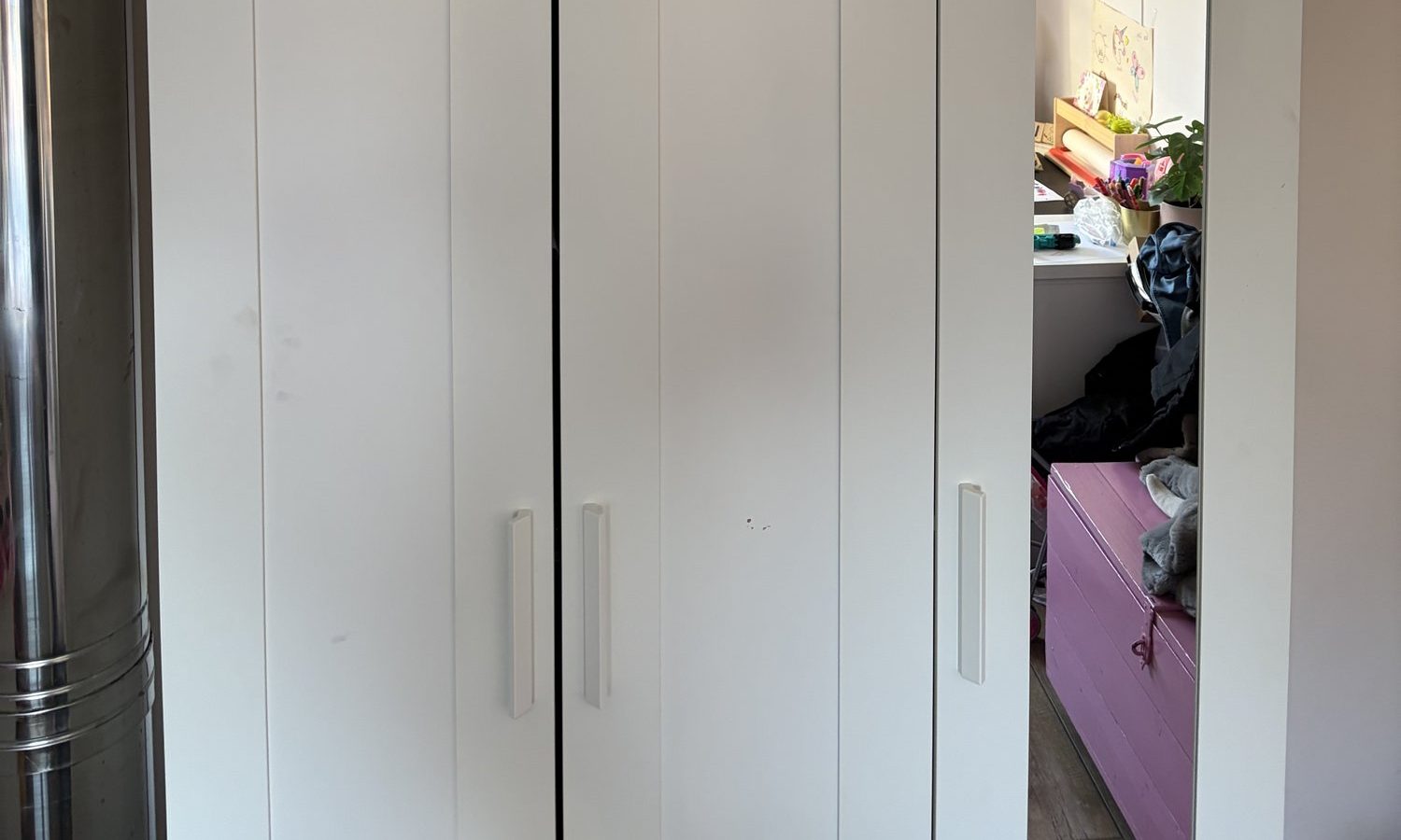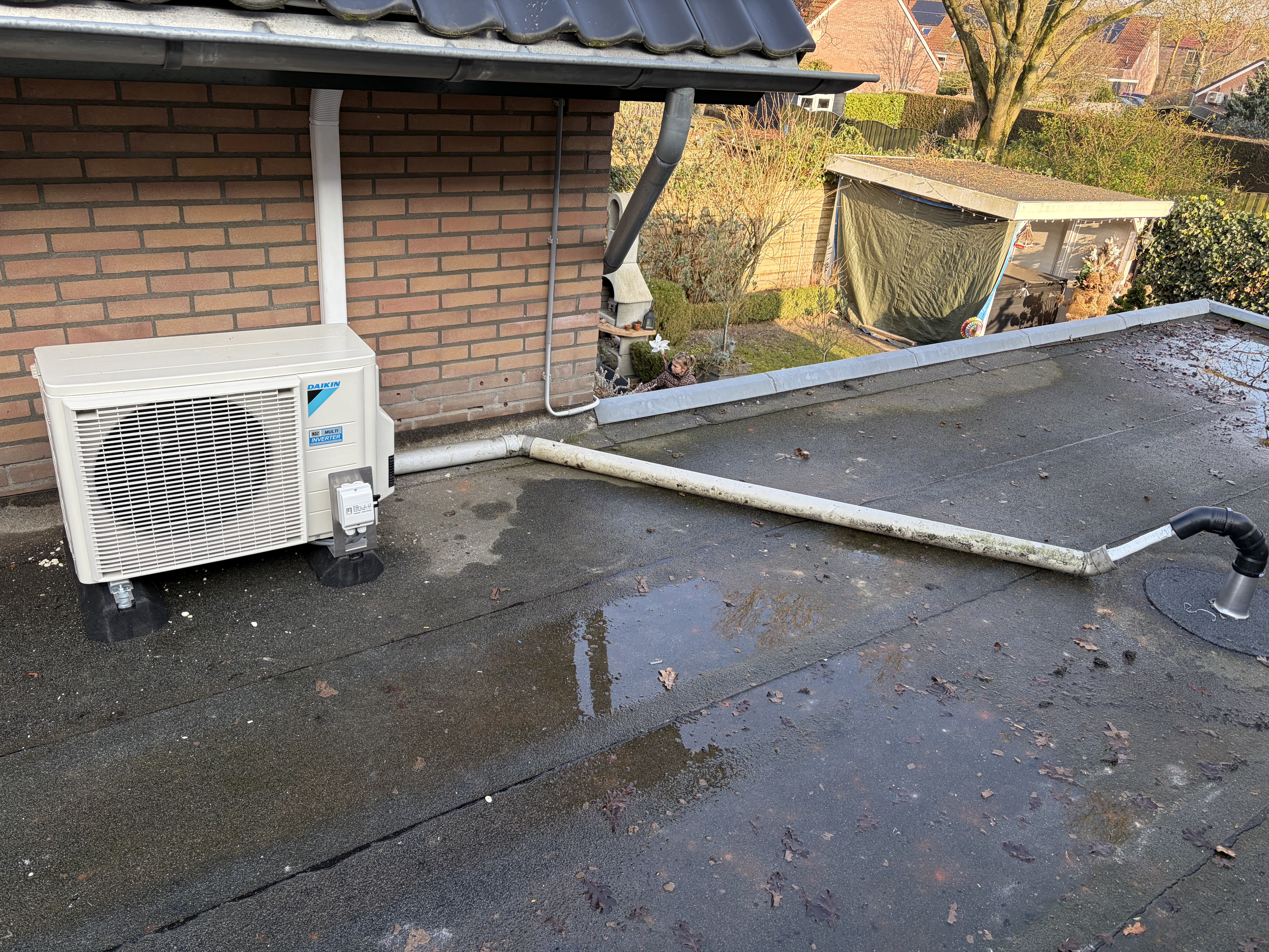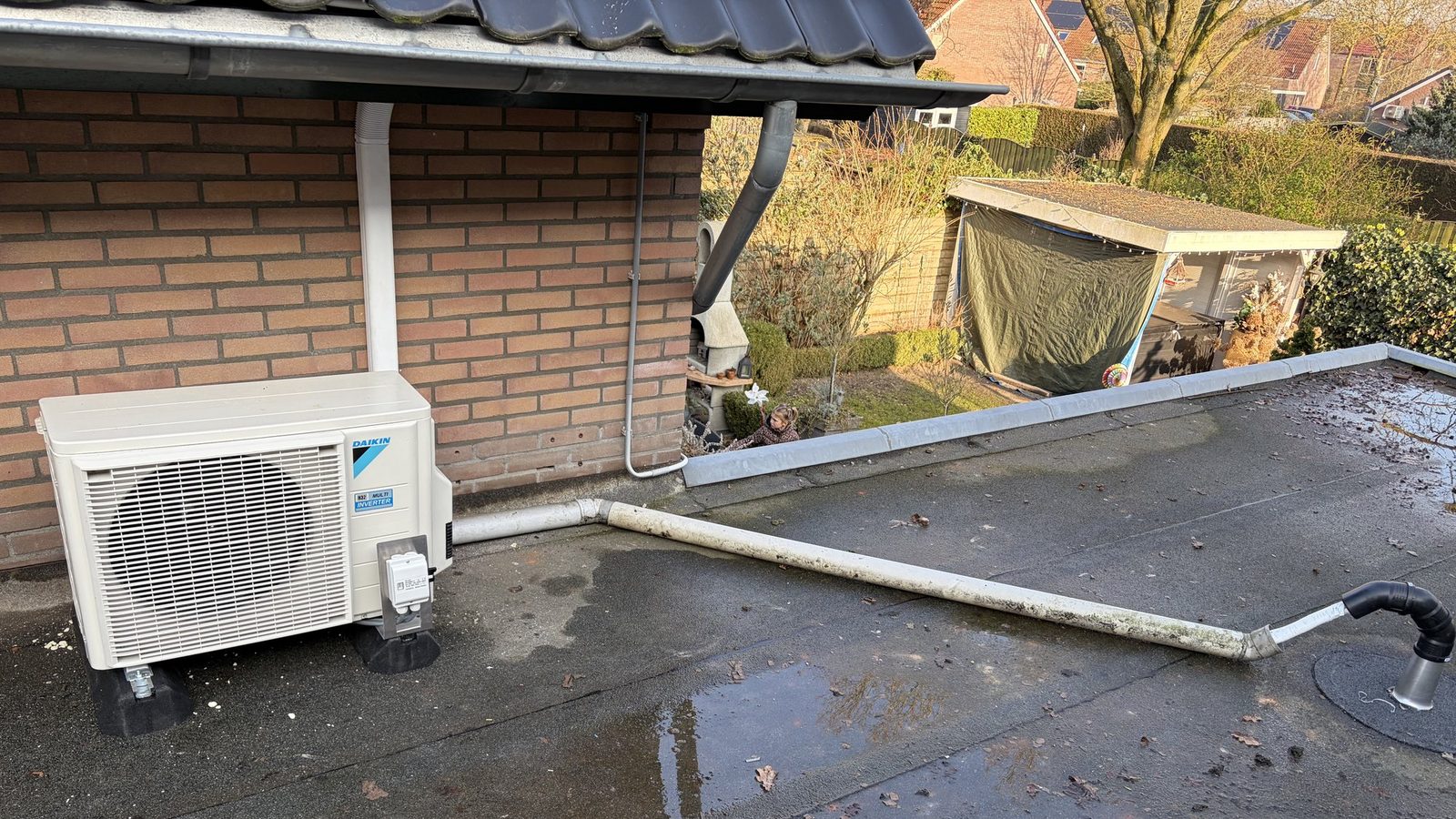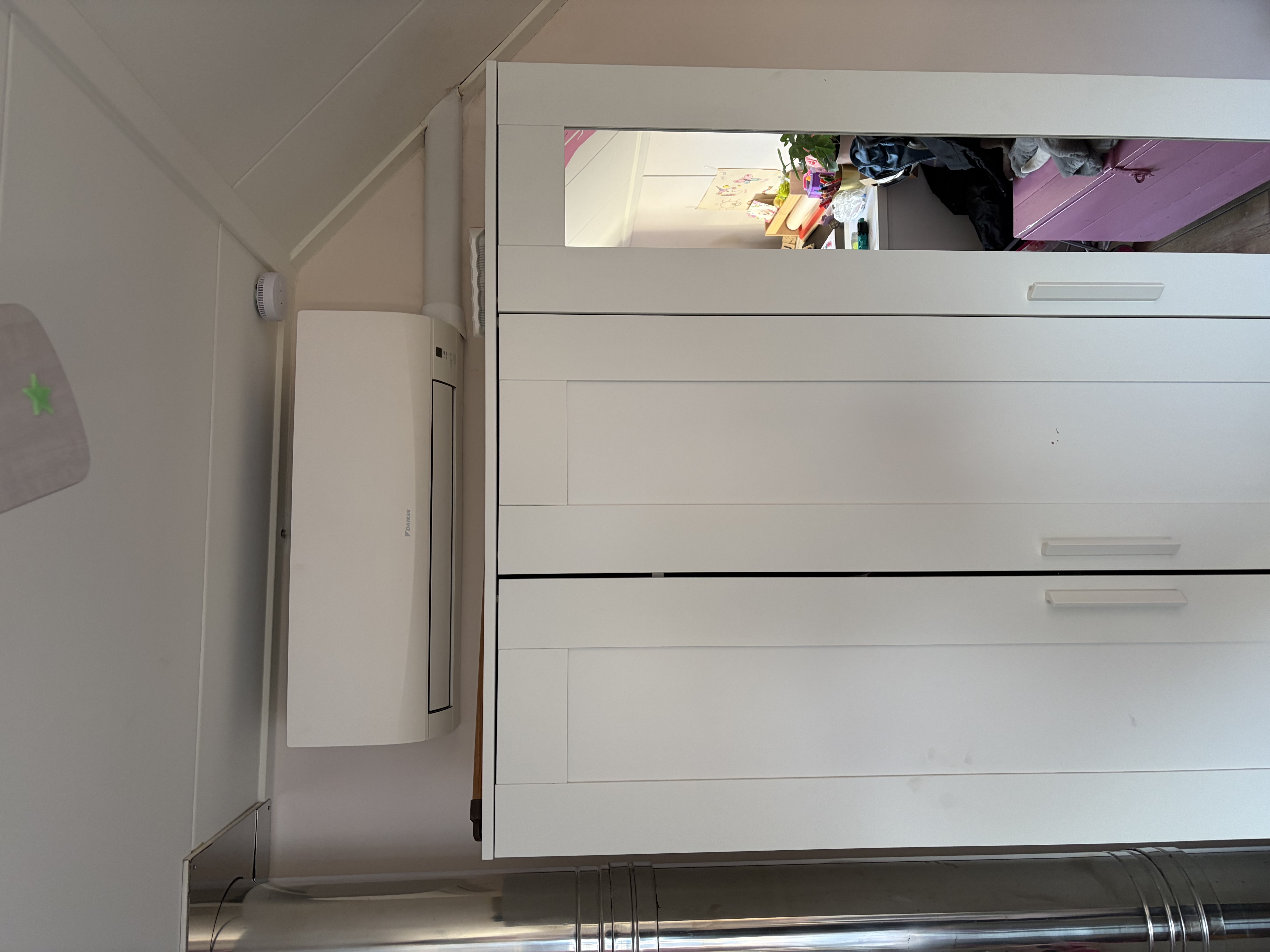 In Apeldoorn installeerden we een Daikin Sensira multi-split: 2 binnenunits van 2,5 kW voor speelkamer en slaapkamer, met een 4,0 kW buitenunit (R32). De units zijn slim gepositioneerd (hoog in de speelkamer en boven de kast in de slaapkamer) en het leidingwerk is strak weggewerkt via dakdoorvoer/dakbeschot naar het platte dak. Met 2 Sauermann condenspompen, opstellingsbalk met rubber dempers en een werkschakelaar op aparte groep draait alles stil, veilig en comfortabel—met wifi-bediening.