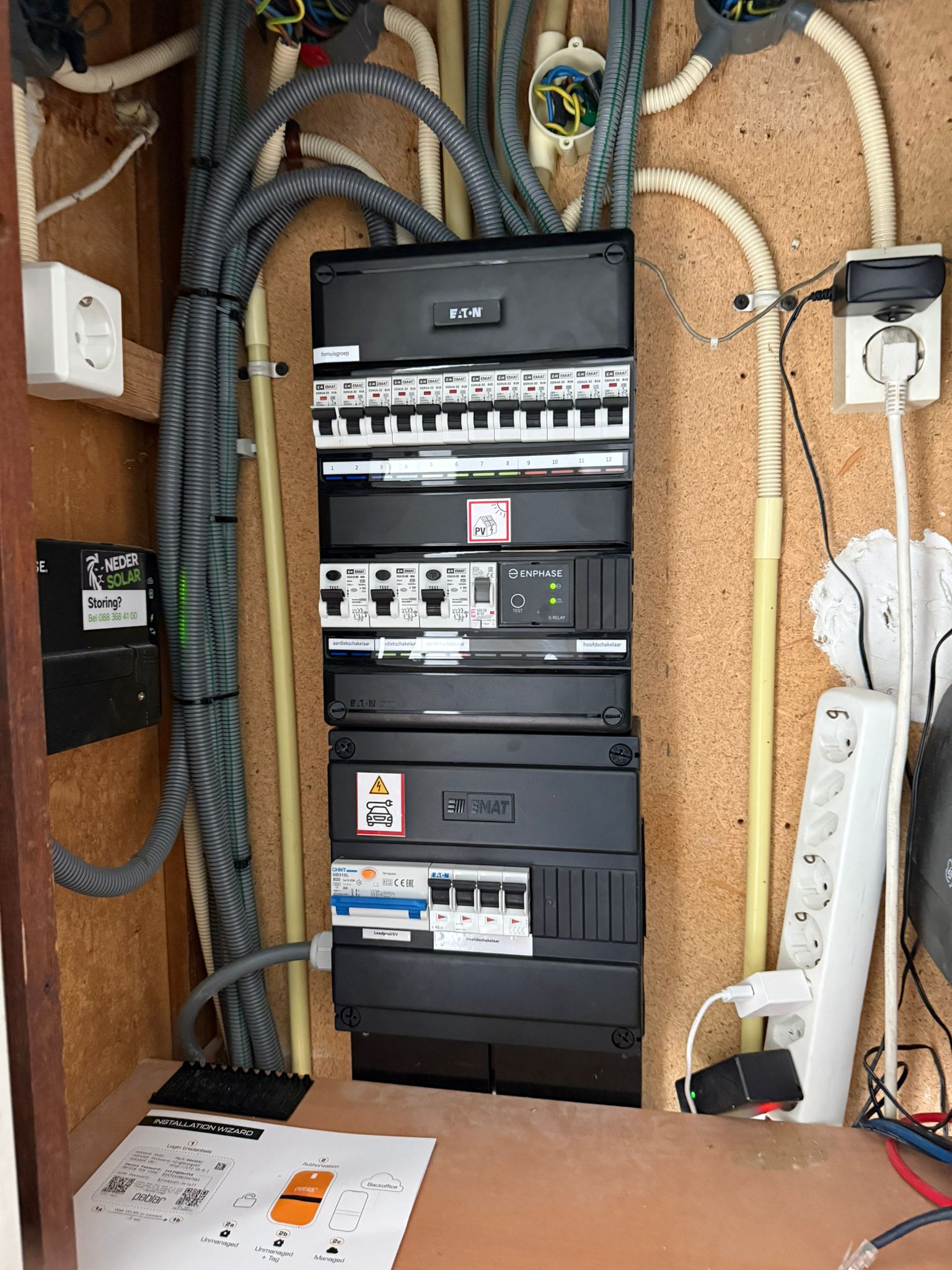 In Apeldoorn hebben we een Peblar laadpaal met 5 meter kabel tegen de gevel geïnstalleerd voor comfortabel thuisladen tot 11 kW. Voor een veilige en toekomstbestendige aansluiting plaatsten we een nieuwe groep, 3-fase hoofdschakelaar, aardlekautomaat en bekabeling in een nette zwarte UV-bestendige kabelkoker. Dankzij de koppeling met de aanwezige HomeWizard werkt het systeem met slim laden en load balancing, zodat de auto efficiënt laadt zonder overbelasting van de installatie.