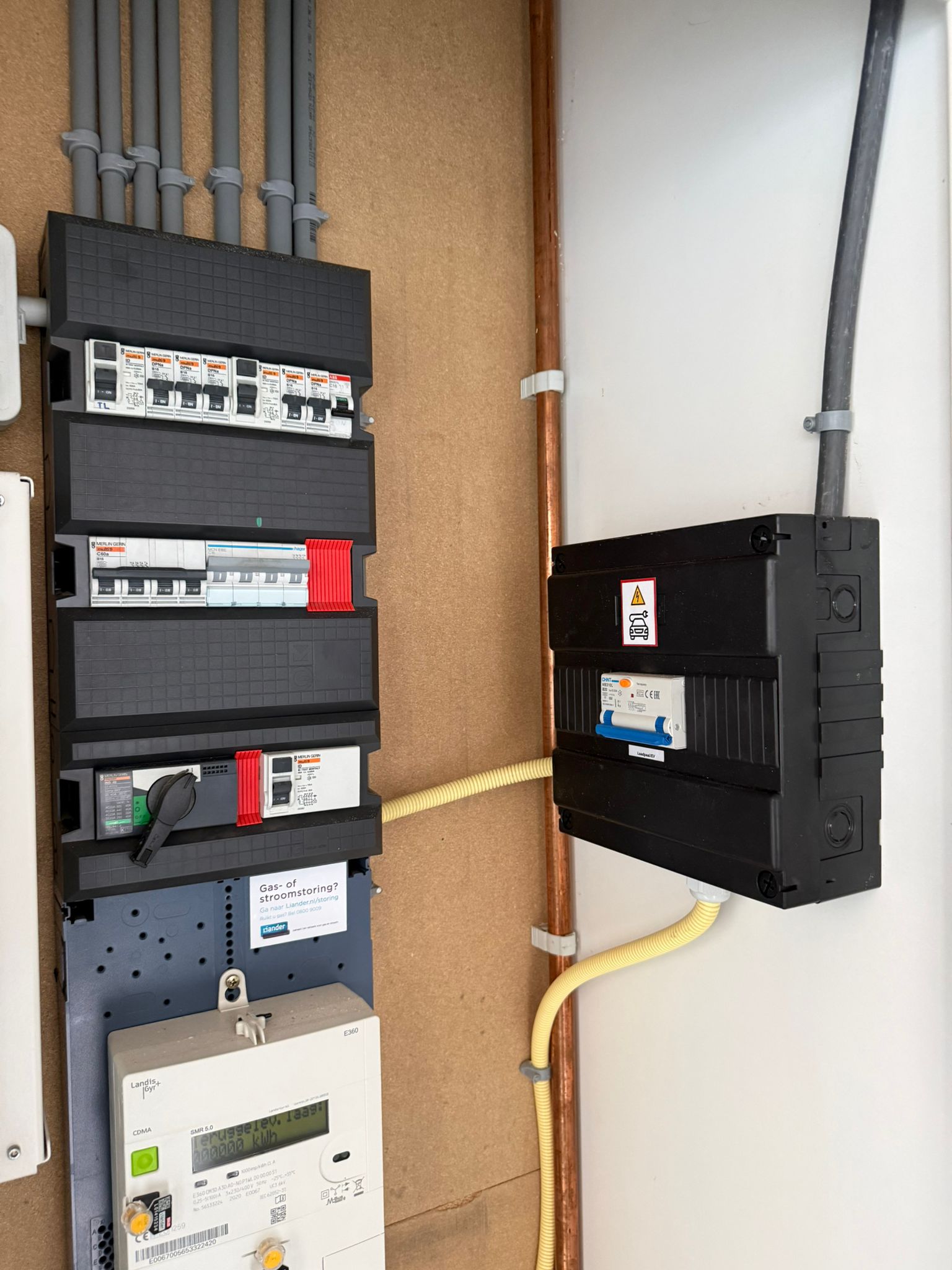 In Apeldoorn hebben we op twee bedrijfspanden elk een Zaptec GO 2 laadpaal op montagepaal geplaatst. De bekabeling is netjes onder het straatwerk naar de stoep aangelegd en in beide groepenkasten is een aparte groep toegevoegd. Dankzij Tibber Pulse profiteren de laadpalen van load balancing en slim laden op zonne-energie. Zo kan er veilig, efficiënt en met maximaal 11 kW per laadpunt worden geladen.