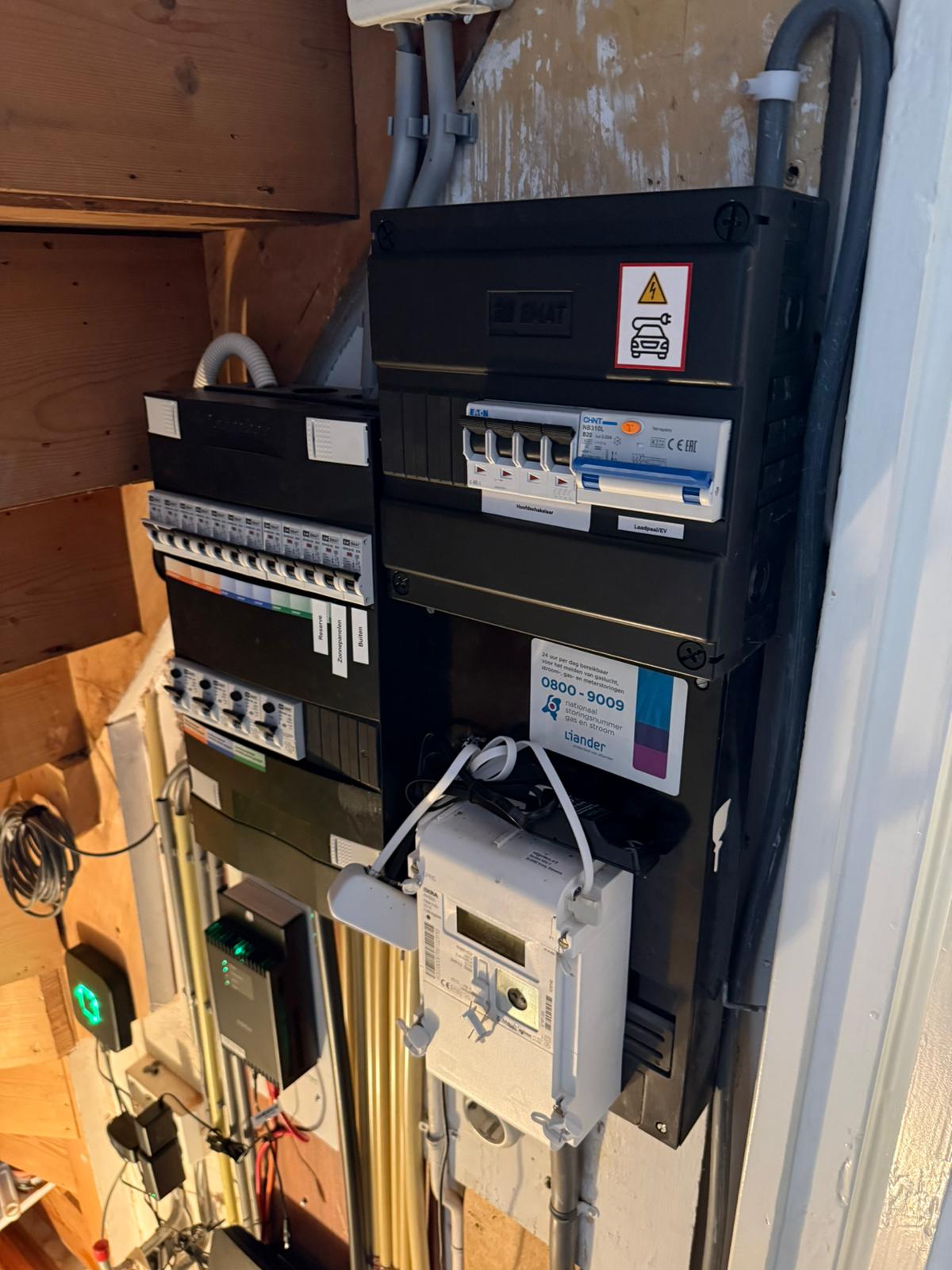 In Apeldoorn installeerden we een Zaptec GO 2 (tot 22 kW, V2G-ready) netjes tegen de gevel. Voor veilig en slim laden plaatsten we een Tibber Pulse in de slimme meter voor loadbalancing, zodat het beschikbare vermogen automatisch wordt verdeeld. In de meterkast kwamen een 3-fase hoofdschakelaar en aardlekautomaat in een compacte opbouwkast. Via de kruipruimte legden we 10 m 5x4 mm² kabel naar de oprit, strak afgewerkt met UV-bestendige kabelkoker.